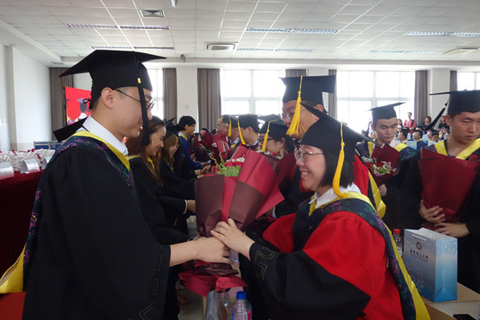 毕业生代表向学院老师献上最美丽的鲜花,为他们的辛勤培育和谆谆教诲表示最衷心的感谢。全体学生宣读了毕业誓言《青春之歌》,共同宣誓:让青春在为祖国、为人民、为民族、为人类的奉献中焕发出更加绚丽的先彩。