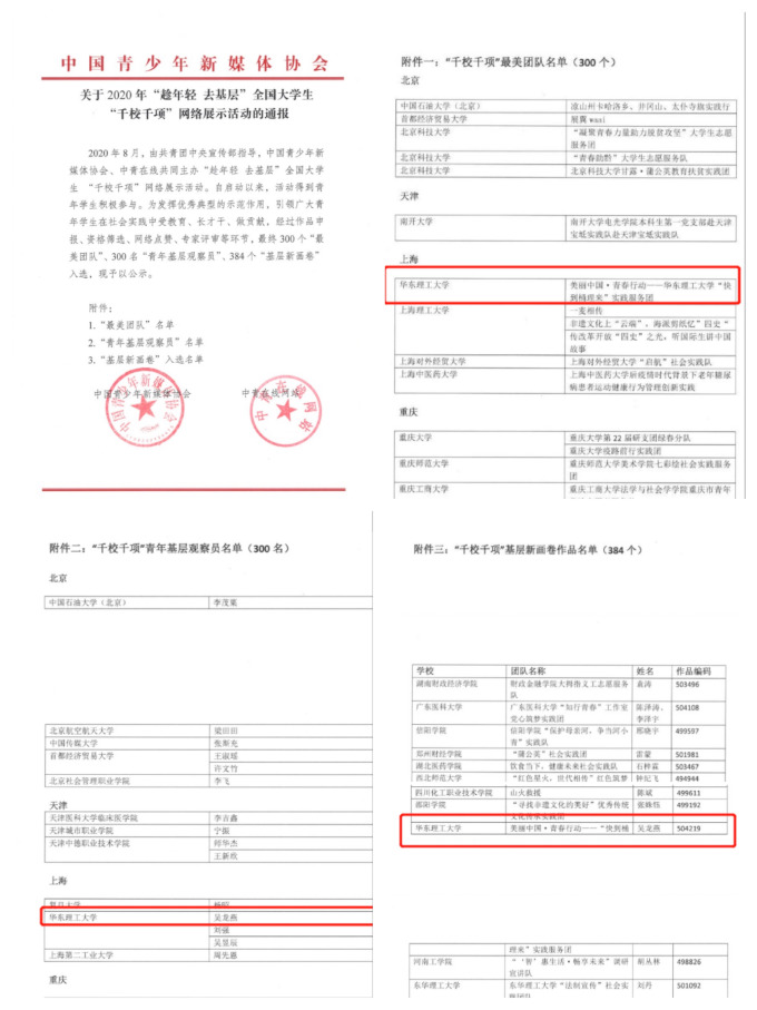 近日,由共青团中央宣传部指导,中国青少年新媒体协会、中青在线共同主办的2020年“趁年轻 去基层”全国大学生“千校千项” 三下乡社会实践网络展示活动评选结果正式揭晓。我院社会实践团揽获2020“千校千项”全国 “最美团队”、“青年基层观察员”、“基层新画卷”三项大奖,这也是我院社会实践团队连续两年荣获团中央“千校千项”全国优秀团队和个人。