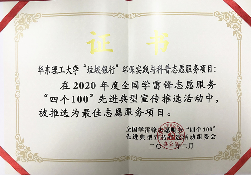 据悉,为深入贯彻落实习近平新时代中国特色社会主义思想,贯彻落实党的十九大和十九届二中、三中、四中、五中全会精神,积极培育和践行社会主义核心价值观,大力弘扬奉献友爱互助进步的志愿精神,进一步健全志愿服务体系,中央宣传部、中央文明办等部门和单位共同组织开展了2020年度全国学雷锋志愿服务“四个100”先进典型宣传推选活动,宣传推选出100个最美志愿者、100个最佳志愿服务组织、100个最佳志愿服务项目和100个最美志愿服务社区。我院参与的“垃圾银行”环保实践与科普志愿服务项目,作为上海市教卫工作党委系统文明办推荐的唯一项目参与上海市文明办评选,经过材料评审、集中展示、网络投票、网上公示等环节,最终入选全国最佳志愿服务项目。这也是自2015年开展全国宣传推选学雷锋志愿服务“四个100”先进典型活动以来,我校获得的最好成绩。
