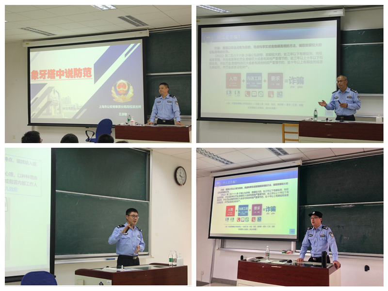 10月15日,学院邀请上海市公安局奉贤分局高校派出所警官吴振霄、王淑敏、邹纪、张志荣来到奉贤校区,为2021级全体本科新生进行防诈骗安全教育讲座。此次讲座分4个会场同时进行,警官们从什么是电信诈骗出发,向同学们介绍了各类诈骗形式的特点及危害,并辅以高校发生的相关案例给同学们敲响警钟。此次安全教育讲座在向同学们普及相关法律知识的同时,也警示同学们一定要提高危机意识和辨别能力,遇到诈骗情况时要保持冷静,理性思考,谨防受骗上当。