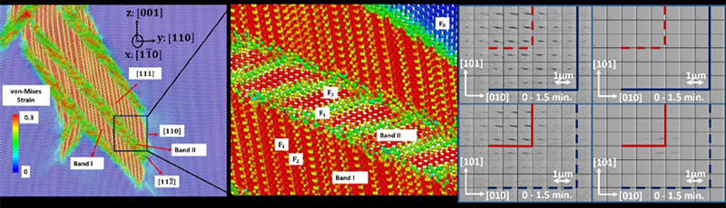 由于硅的马氏体相变具有很高的各向异性,硅的马氏体相变并不遵循经典的晶体学理论方程。研究发现硅在高压下,由大变形的Si I和Si II的第三变量结合组成的纳米条带通过{111}面和基体的Si I结构构成了新的马氏体相变结构。通过大变形马氏体相变理论推导,可以发现这种结构最小化了界面不匹配度,从而降低了系统整体的变形能。通过不含位错的硅试样的原位X射线衍射实验,实验过程中并没有发现孪晶条带和大变形Si I。但通过预置位错的Si试样,可以同时发现孪晶条带和大变形Si I条带的出现。分子动力学模拟和原位X射线衍射实验互相验证了这种新的马氏体相变结构。
