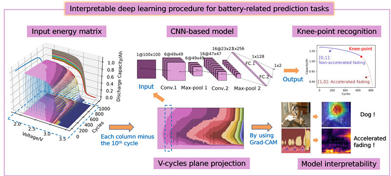 在锂电池寿命预测领域,建立全面的电池老化模型一直是一项艰巨任务,因此数据驱动方法正受到越来越多的关注。深度学习已被证明是电池应用领域中一种强大的数据驱动拟合方法。然而,可解释性仍然是该领域面临的挑战,限制了深度学习方法的实际应用。随着可解释技术的发展,深度学习不仅可以作为黑盒工具,还可以用于探索外部电池数据与内部电化学变化之间的关系。研究团队提出了一种可解释的深度学习框架,利用梯度加权类激活映射(Grad-CAM)来解释训练好的卷积神经网络(CNN)模型的输入和输出之间的联系。