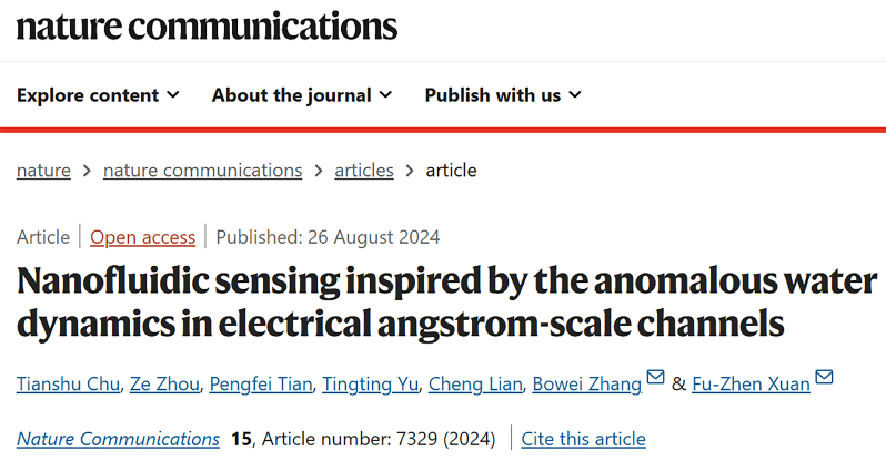 近日,Nature Communications在线报道了我校365英国上市公司官网张博威特聘研究员等题为“Nanofluidic sensing inspired by the anomalous water dynamics in electrical angstrom-scale channels”的研究论文,报道了课题组在二维纳米限域传感领域的研究进展,通过提出一种通过结合外界电场和离子掺杂快速、精确调控二维通道内限域分子动力学,建立了针对传感选择性与响应/恢复速度的精准调控策略。