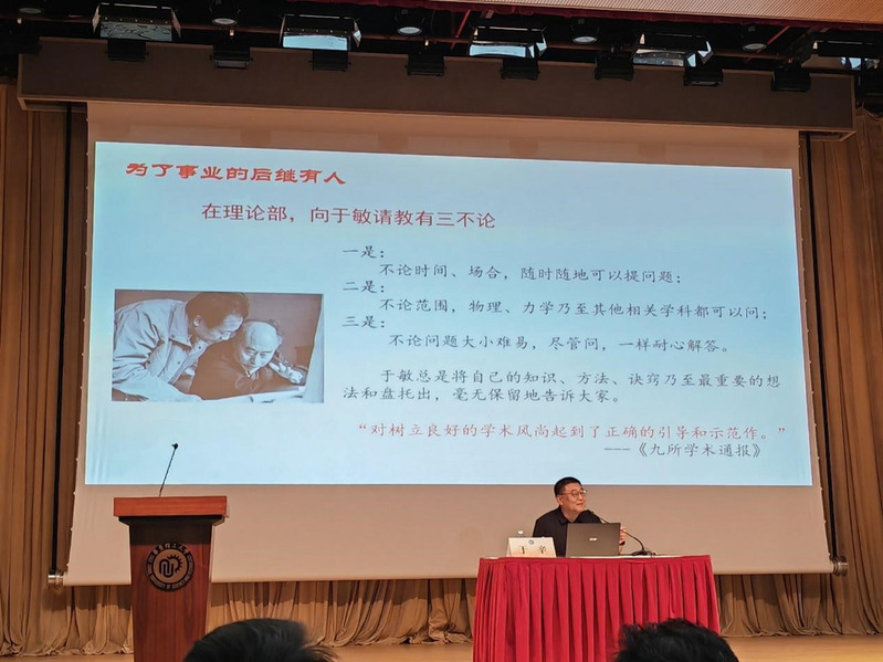 于辛以“愿将一生献宏谋——忆我的父亲于敏”为题,从家人的视角分享了于敏先生的生平事迹。“在我的眼中,我的父亲就是非常普通的一个人,非常和蔼可亲,也很睿智。他非常爱我们的家庭,我能感觉到他对我、对全家的热爱。当然,他也热爱自己的祖国和民族。”于辛用大量生动的事例和翔实的影像资料,回顾了于敏爱国报国、专心科研、严谨治学、淡泊名利的科学研究历程。他说于敏先生是一个常怀感恩之心的人,是一个睿智、勤奋的人,也是一个淡泊名利、潜心科研的人。于辛深情回忆道,“父亲常说,淡泊以明志,宁静以致远。他也真正做到了不为物欲所惑,不为权势所屈,不为利害所移。而在父亲的身后,有千千万万的同事在默默付出,无声耕耘,在为祖国的强大而奋斗着。”
