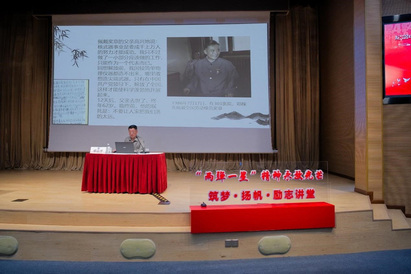 邓志平以“许身国威壮河山——我的父亲邓稼先生平事迹”为题深情追忆了邓稼先的科技报国之路。邓志平回忆道,“父亲少时的这种生活经历让民族独立和国家富强成为父亲一生的梦想与追求。”邓志平生动讲述了邓稼先在研制原子弹、氢弹过程中的艰辛历程,在面对极端危险时对科学真理的无畏探索和对国家事业的忘我奉献精神,以及邓稼先带领科研团队披荆斩棘、突破重重技术壁垒的事迹。