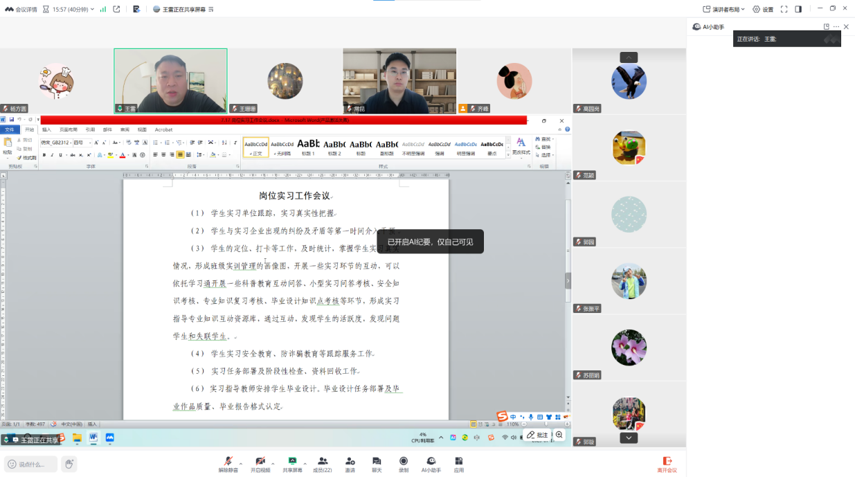 为深入贯彻落实学校关于实践育人的工作要求,进一步规范暑期岗位实习管理,督促未到岗学生尽快到岗,提升学生实践能力与就业竞争力,7月17日beat365平台官方网站线上组织召开2025年暑期岗位实习工作推进会。学院院长王雷、23级岗位实习指导教师参加会议,会议由学院副院长齐峰主持。