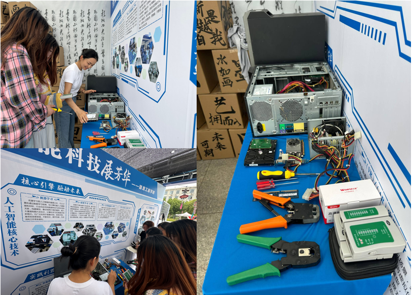 活动前期,实训室管理教师带领学生们分工协作,有条不紊地进行布展工作。从规划展区布局,到陈列各类计算机硬件设备;从调试展示用的电脑,到准备科普资料,每一个环节都凝聚着师生们的心血。他们用专业与热情,为活动的顺利开展奠定了坚实基础。