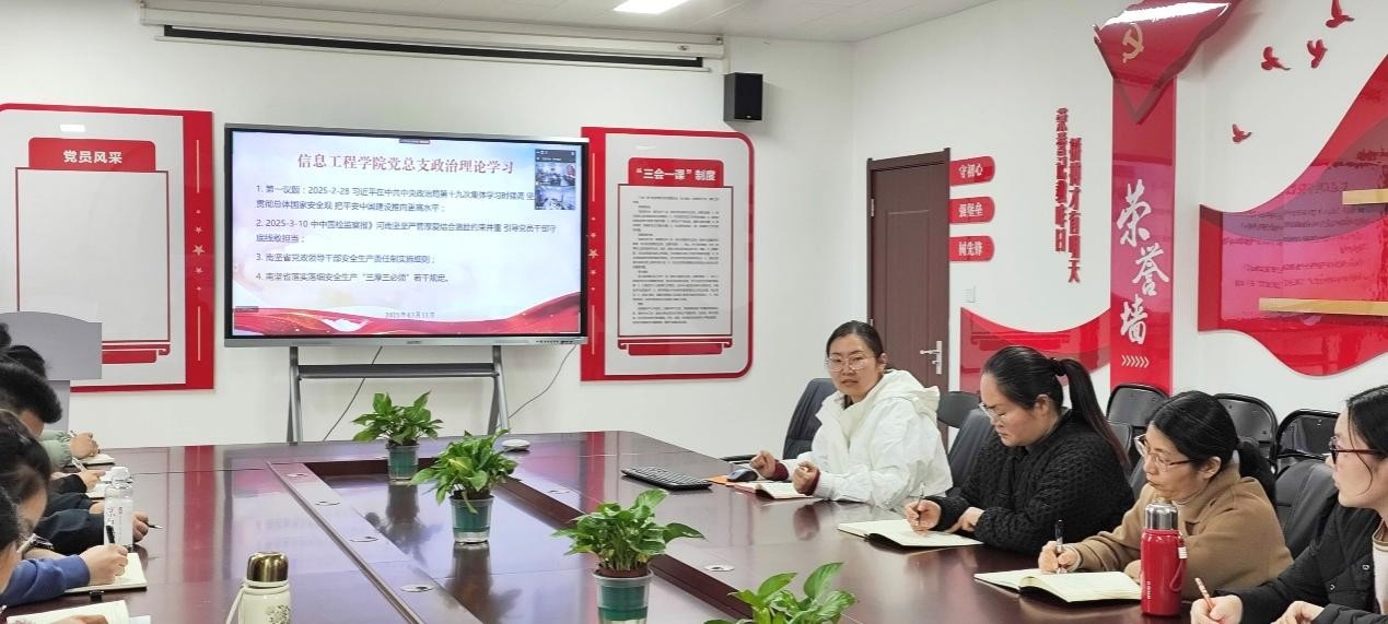 2025年3月11日,beat365平台官方网站党总支组织郑州、开封两校区全体党员及教师,在郑州校区A514、开封校区F314以腾讯会议视频连接,开展政治理论学习活动。本次学习活动由beat365平台官方网站副院长夏丽珍主持,全体党员及教职工参加会议。主要学习内容有:1.第一议题:习近平在中共中央政治局第十九次集体学习时强调 坚定不移贯彻总体国家安全观 把平安中国建设推向更高水平;2. 《中国纪检监察报》河南坚持严管厚爱结合激励约束并重 引导党员干部守底线敢担当;3. 河南省党政领导干部安全生产责任制实施细则;4. 河南省落实落细安全生产“三厚三必须”若干规定。