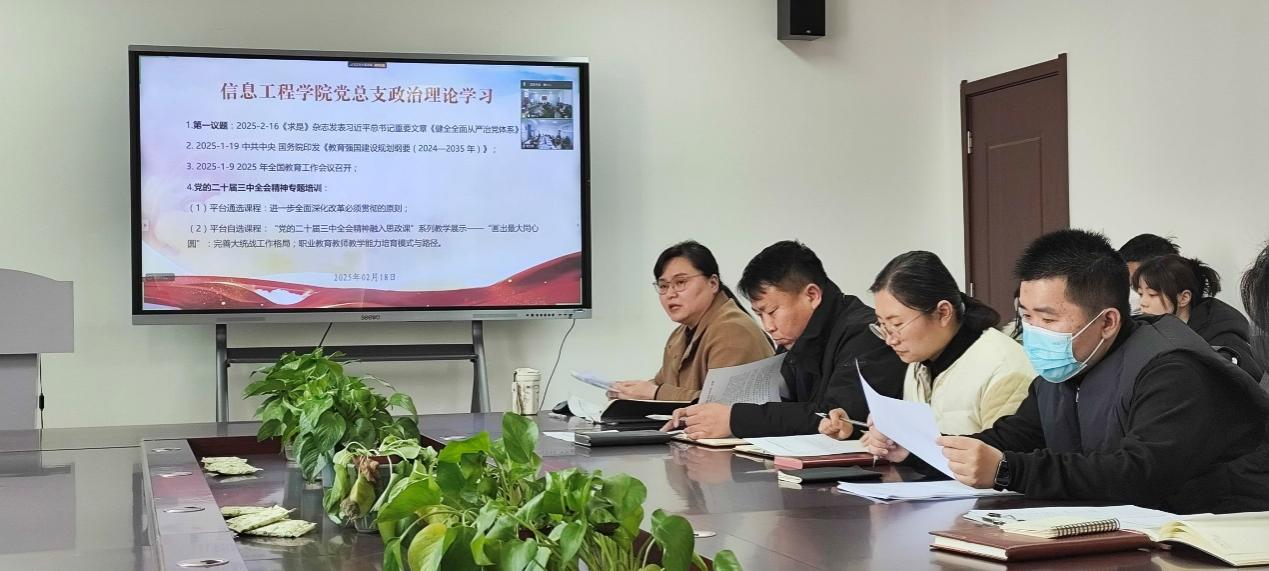2025年2月18日,beat365平台官方网站党总支组织两校区全体党员及教职工,在郑州校区A514、开封校区F314以腾讯会议视频连接,开展政治理论学习。本次学习活动由beat365平台官方网站党总支书记崔琳主持,全体党员及教职工参加会议。主要学习内容有:1.第一议题:2025-2-16《求是》杂志发表习近平总书记重要文章《健全全面从严治党体系》;2.2025-1-19 中共中央 国务院印发《教育强国建设规划纲要(2024—2035 年)》;3.2025-1-9 2025 年全国教育工作会议召开;4.党的二十届三中全会精神专题培训:(1)平台通选课程:进一步全面深化改革必须贯彻的原则;(2)平台自选课程:“党的二十届三中全会精神融入思政课”系列教学展示——“画出最大同心圆”:完善大统战工作格局;职业教育教师教学能力培育模式与路径。