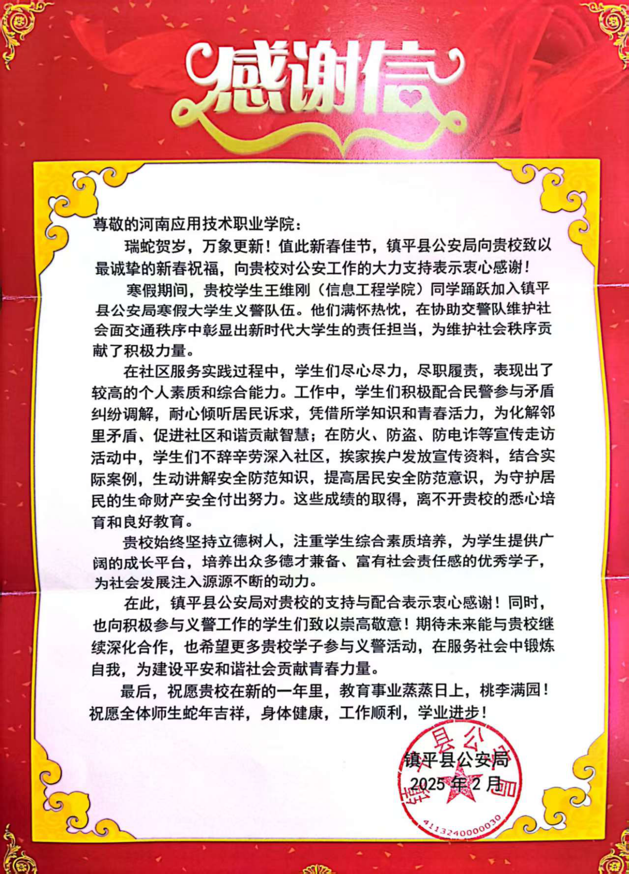 2月21日,beat365平台官方网站收到来自河南省南阳市镇平县公安局的感谢信,信中表达了对beat365官网学生王维刚寒假期间加入镇平县公安局寒假大学生义务警队,协助指挥交通、维护交通秩序的赞扬,也对学校育人成果表示感谢。