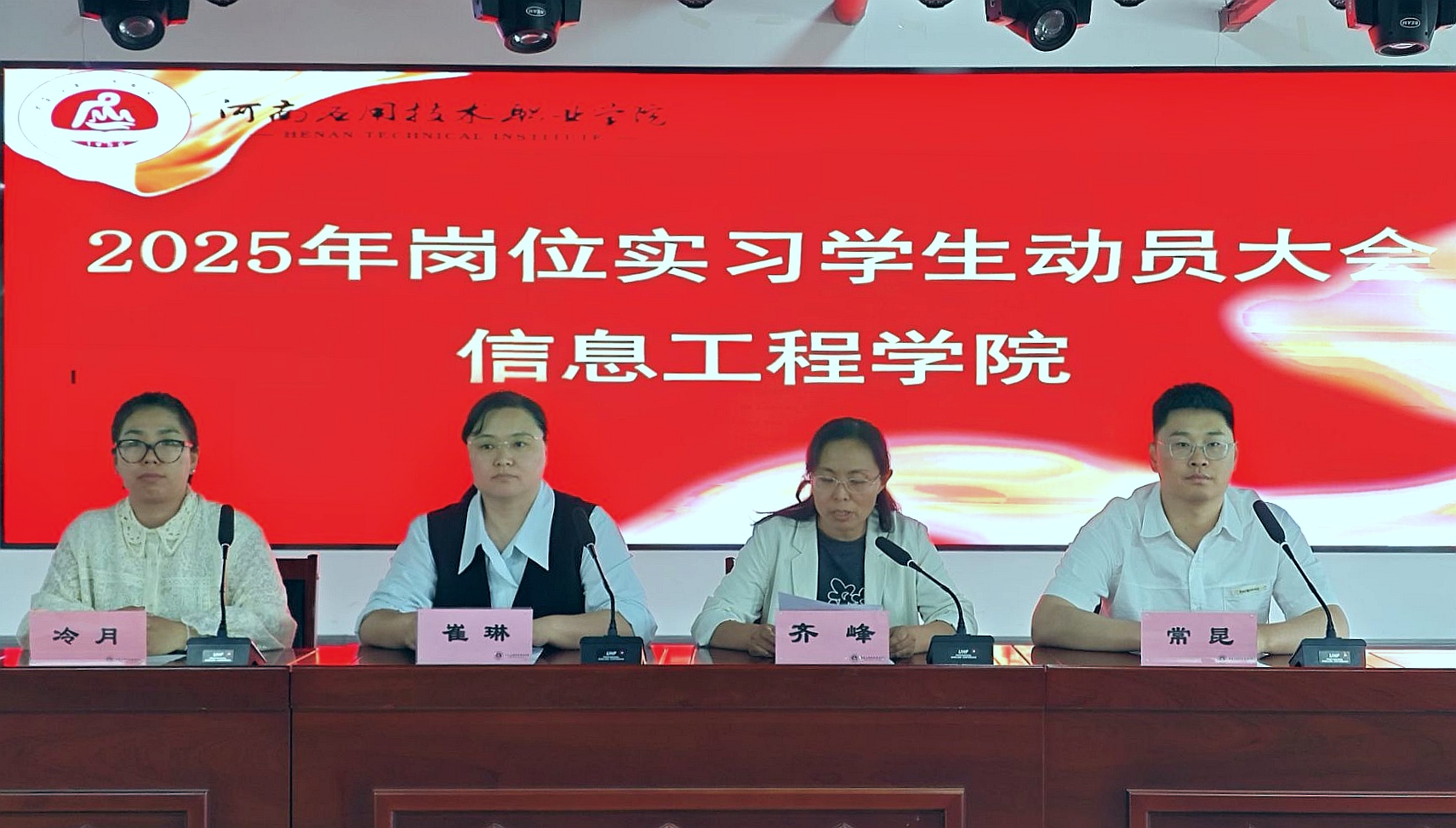 为贯彻落实党中央、国务院关于高校毕业生就业工作的决策部署,加强2026届毕业生对岗位实习重要性的认识,提升学生的实践能力和职业素养,确保学生岗位实习工作的顺利进行,河南应用技术职业学院beat365平台官方网站于2025年4月29日在开封校区(北院)学生活动中心召开了2026届毕业生岗位实习动员大会。beat365平台官方网站党总支书记崔琳、副院长齐峰、学工办主任常昆、团总支书记冷月、企业代表、2026届毕业班辅导员、实习指导教师及2026届各班级毕业生代表参加大会,会议由副院长齐峰主持。