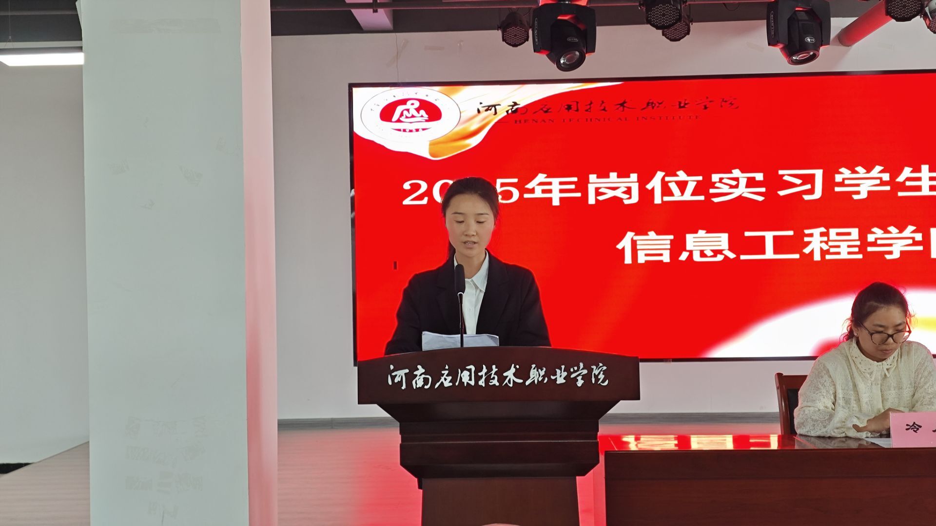 崔琳作动员讲话,通过对往届毕业生精彩的岗位实习经历的分享,鼓励同学们珍惜实习机会,勇敢面对挑战,为未来的职业发展打下坚实的基础。她强调,实习是学校教学的重要一环,同学们要认清实习期间的双重角色,端正态度、遵守规章制度、服从单位管理,在实习岗位上练就过硬本领。